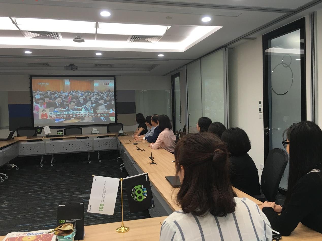 (德勤华永会计师事务所深圳分所党总支在行业党委委员俞善敖的带领下,组织在岗党员和员工在事务所会议室集中收看开幕式)